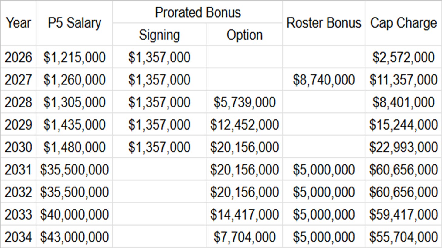 Fully Guaranteed Money: 2026 at signing, 2027 on the fifth day of the league year, 2028-30 on the fifth day of the 2028 waiver period