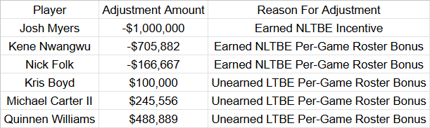 For instance, if a player has a workout bonus of $50k, and a per-game active roster bonus of $1.7 million ($100k per game), and he was active for all 17 games the previous season, that’s a total adjustable charge of $1.75 million.